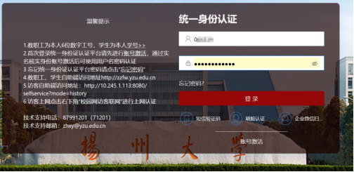 1)登录用户名为【学号】,密码已修改的为私人密码/未修改的为Yzdx@学号,如学号为MZ220220999,则密码为Yzdx@MZ220220999(首次如修改密码,修改后一定要记清楚!后面会反复使用)。