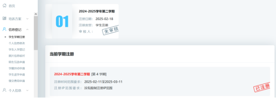 3)学生学期注册页面点击右边【提交注册】后,页面显示【当前注册学期】--【已注册】--【审核状态】--【未审核】 (图5)。