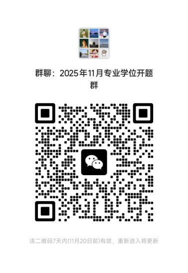 2023级学员、往届部分未开题学员以及需重新开题学员(注意:课程学分未修满、学费未交齐者均不得参加开题!)扫码进“2025年11月专业学位开题群”。请于2025年11月16日之前加入群,逾期视为放弃开题。